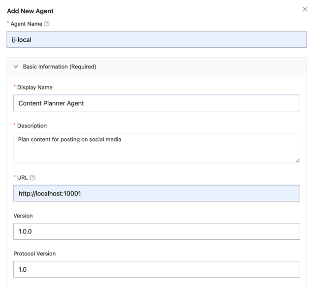 ij-local) and the URL of your A2A agent